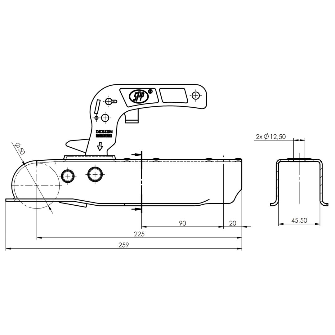 Tête d'attelage remorque Carré 45mm 750kg