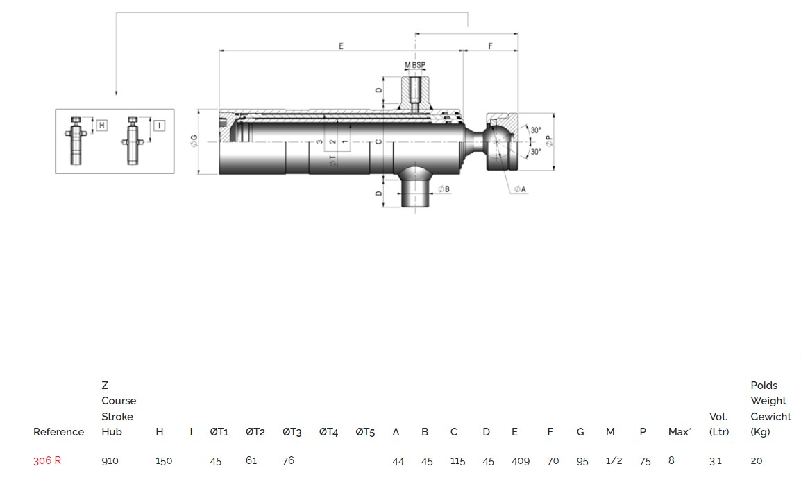 Vérin simple effet 3 étages avec rotule à souder