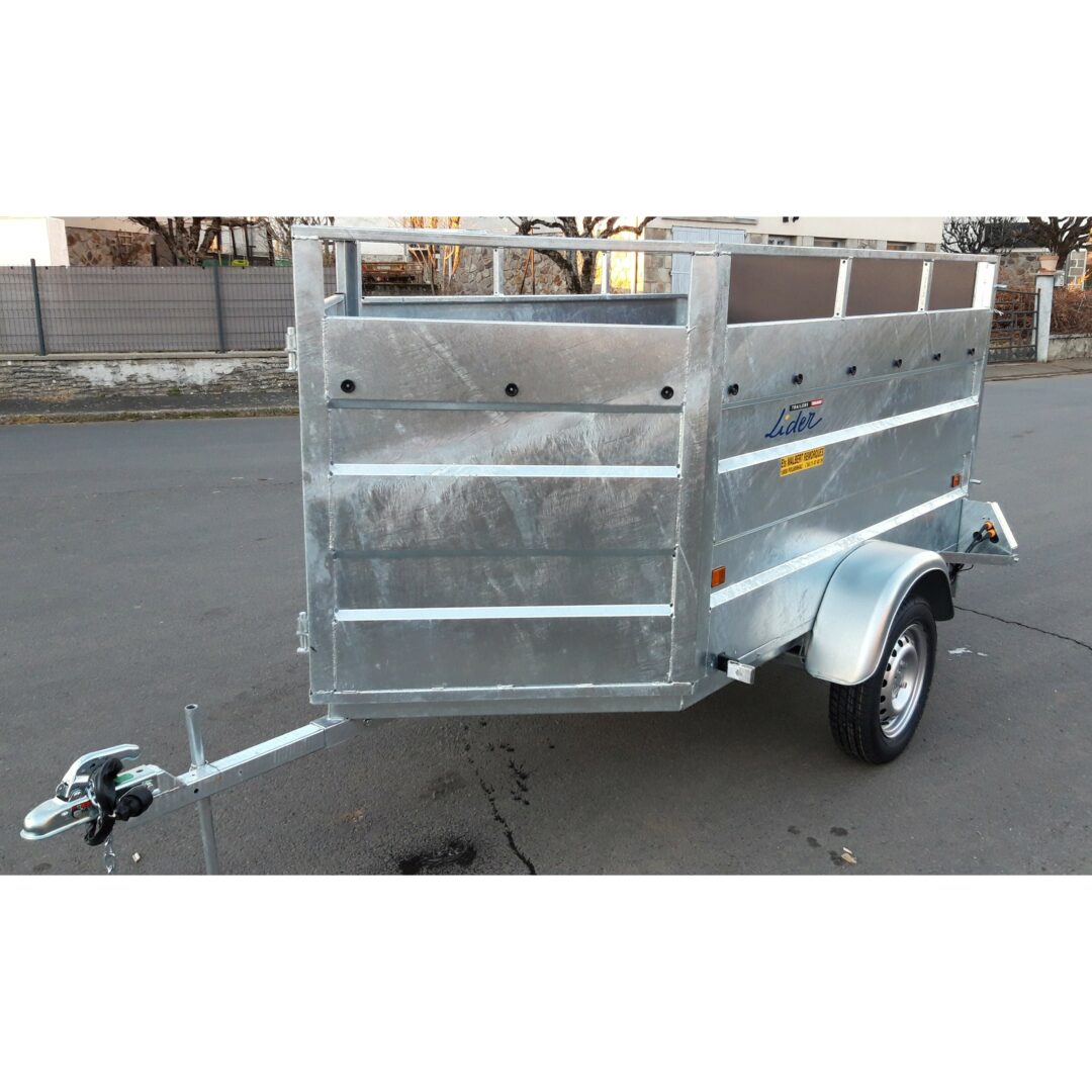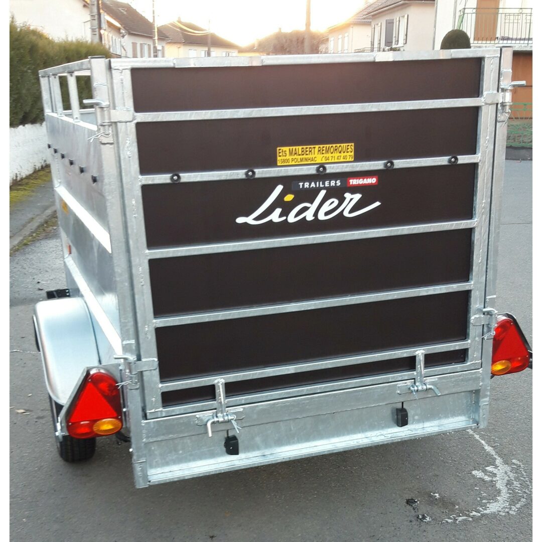 Remorque Lider modèle GRANADA 39530 2m50 x 1m25 hauteur 1m10 Masse à vide 265kg 1 essieu 750kg non freiné , équipée roues 155/70x13 , timon droit avec béquille PTAC 500/600/650/750 kg